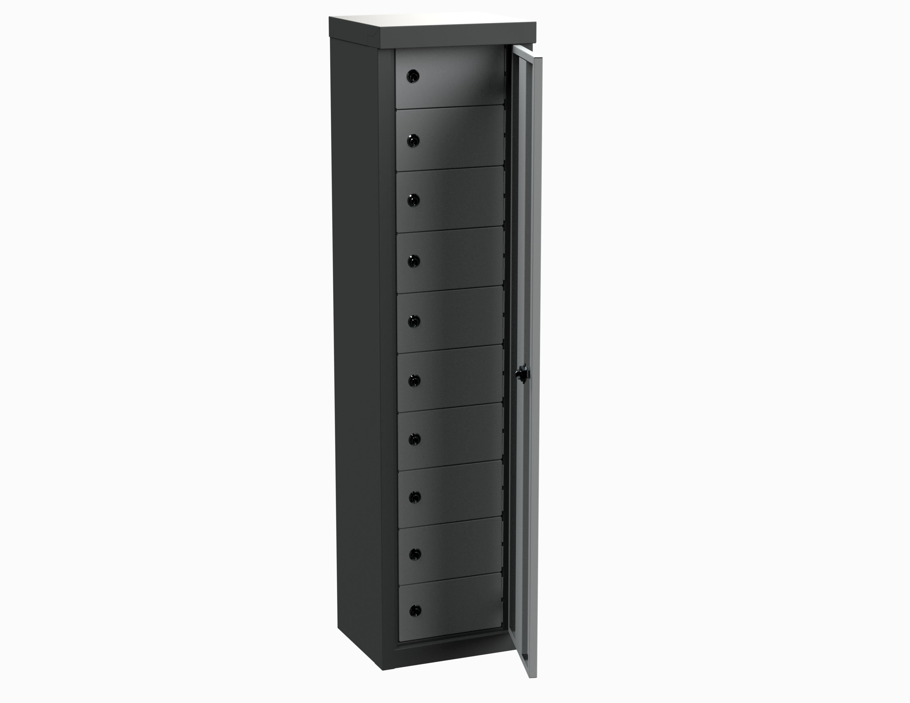 Extra Secure Phone Lockers designed particularly for Schools in mind and the allowing safe secure storage and allows total control of pupils phones in the school. These UK Manufactured wall mounted tough small compact lockers have 10 individual lockable secure doors and a full length lockable door which covers the 10 compartments and is secured and can only be accessed and unlocked by the teacher at certain times when school policy allows the pupils to use phones. The internal doors can be manufactured from either steel and powder coated in various colours or they can be manufactured from 10mm clear polycarbonate allowing the members of staff clear viewing inside each compartment and can quickly identify any missing phones. With a large range of locking options available including cam locks, Hasp Locks, Mechanical Combination locks. Each door can be numbered if required or have a name holder.