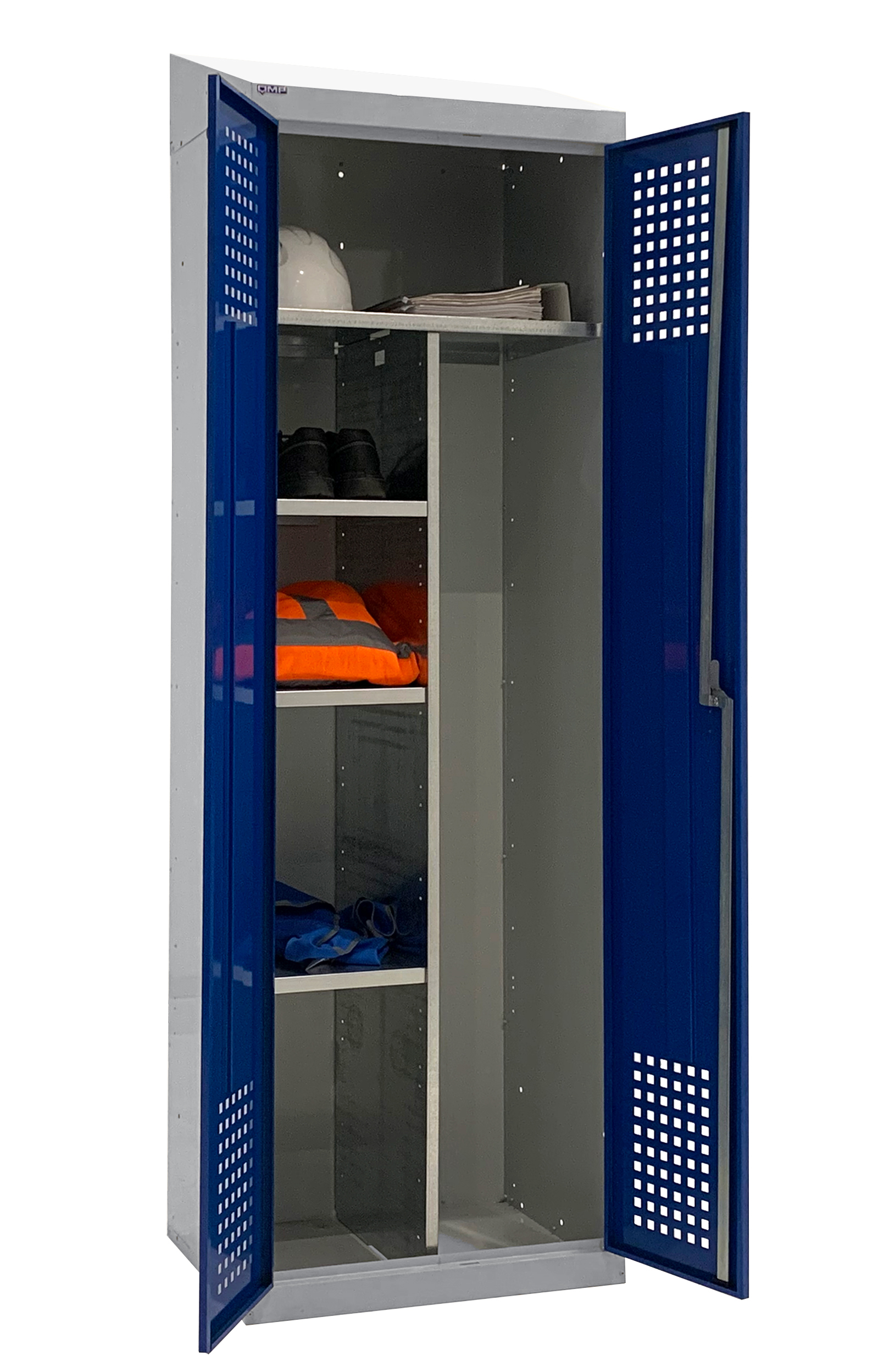 The locker has a top shelf with a central divider and 3 Shelves and complete with a garment hanging rail and 2 x captive coat hangers.