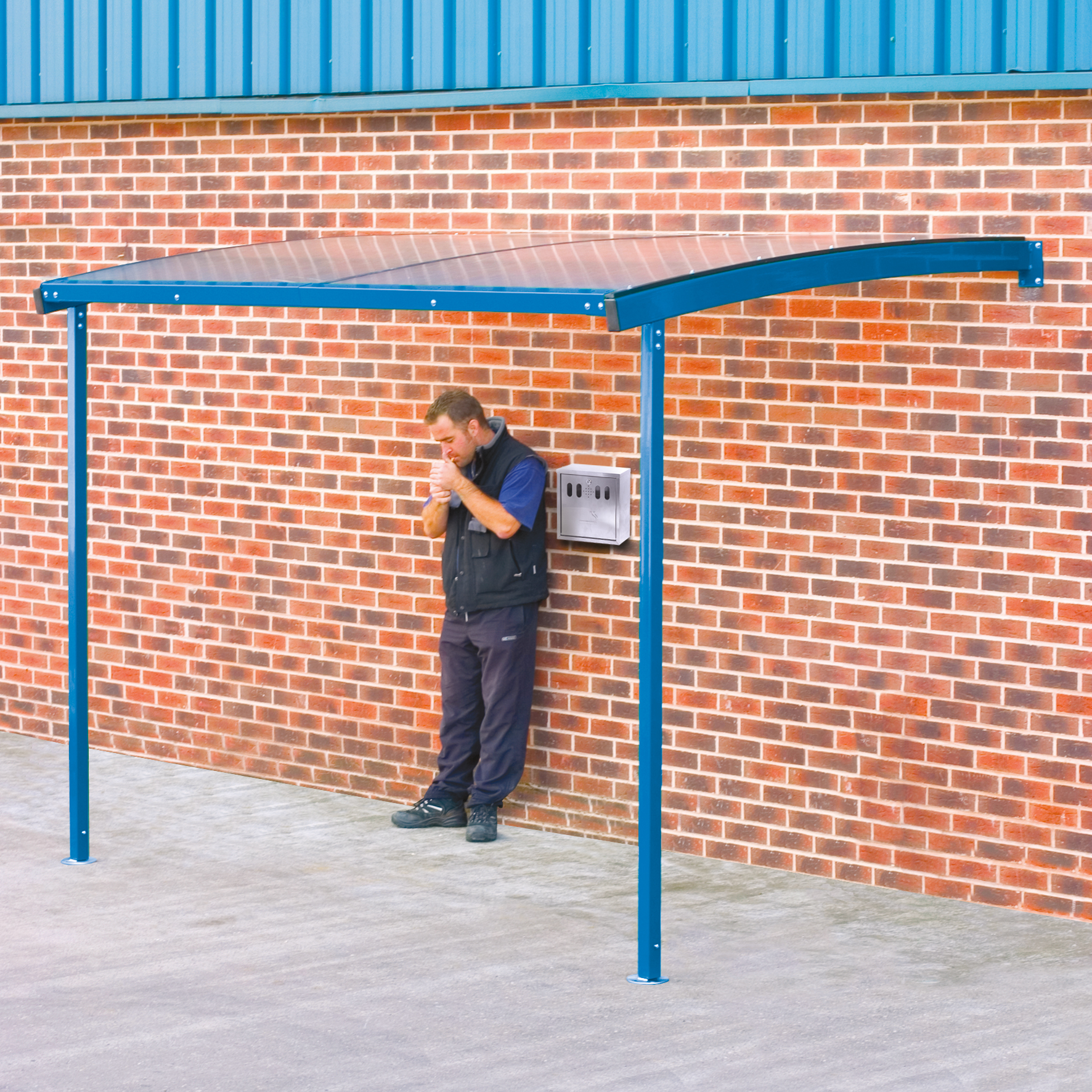 Smoking locker shelter canopies are either Wall fixed alone or wall fixed and floor supported. Mounted and designed and manufactured to help smaller businesses comply with legislation governing smoking at work and available for delivery in 5 working days. They can also be used over the top of external outside Steel or Plastic lockers providing a cover to avoid water ingress inside each locker compartment.